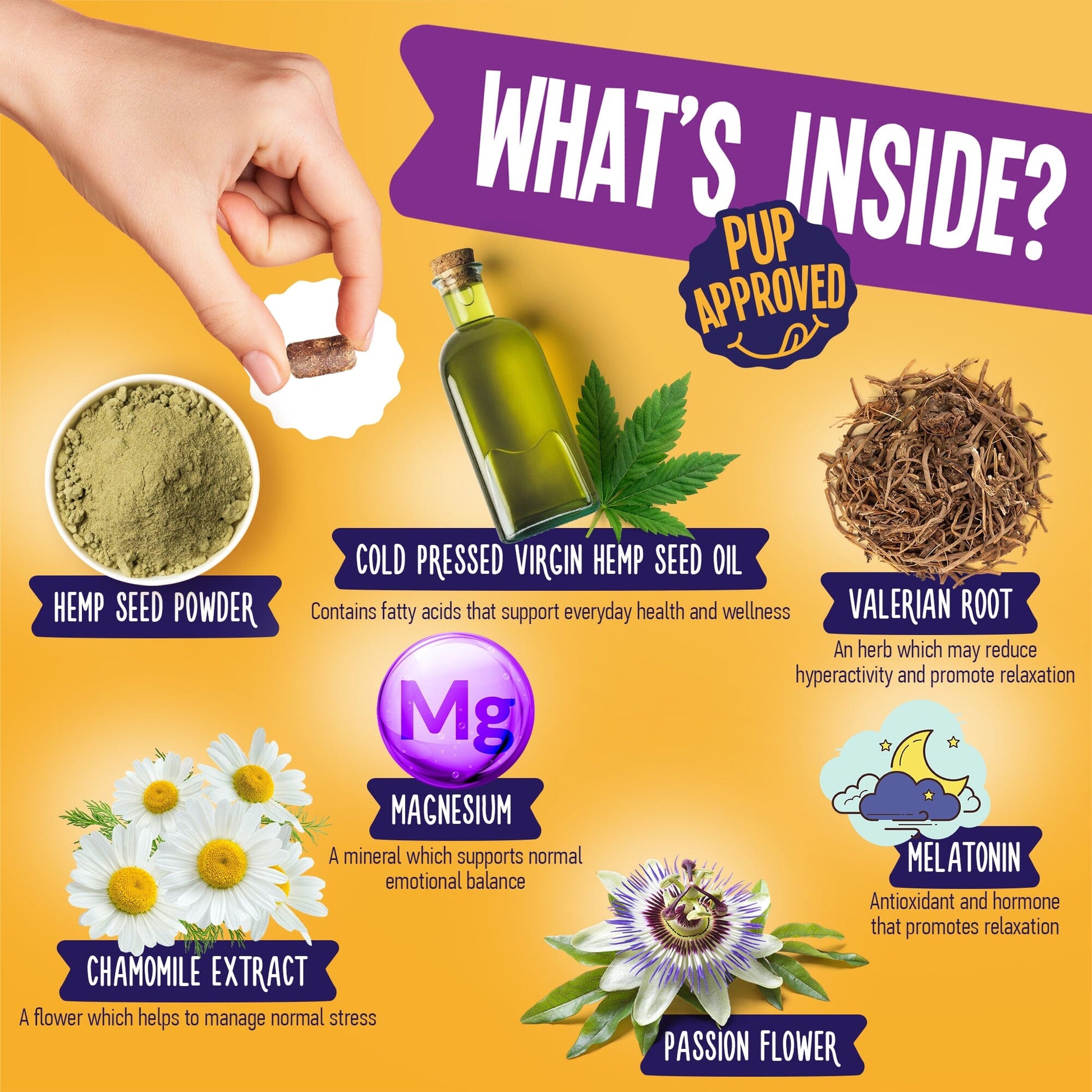 - Formulated with valerian root, hemp extracts, chamomile, melatonin, magnesium, and passion flower;