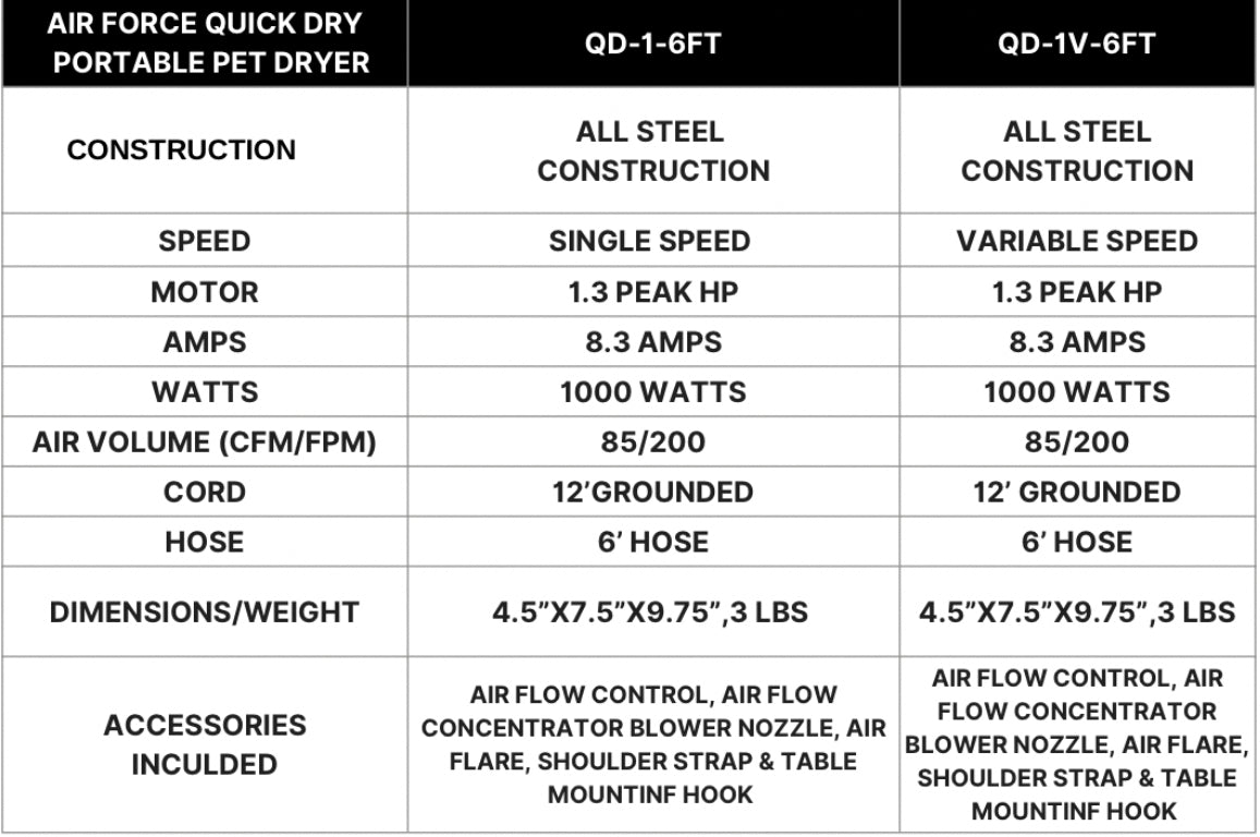 - The Air Force® Quick Draw® produces 10 times more blowing power than a human hair dryer and best of all it's safe for all pets because there's no heating element to dry out their coats or burn their skin.