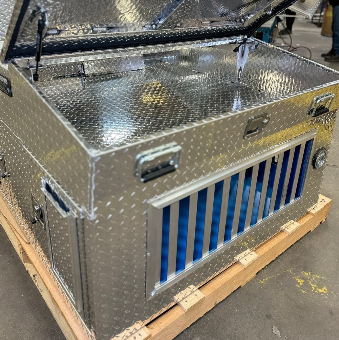 Hunter Series Big T Double Compartment Dog Box with Dual Lid Top Storage. Features a rugged diamond tread aluminum construction with tall dual dog compartments lined with plastic corrugate. Big T features our largest capacity lockable top storage compartment for valuables such as guns, electronics, hunting gear and more. Big T also features dual top storage lids allowing you to conveniently access your gear from the side of your truck. Lockable slam latch doors with storm covers are slotted for crate cooling fans. Vented with all seasons oversized side (12 x 30) and rear (12 x 12) vents for maximum air flow with storm covers. Center divider has air holes for cross ventilation between the compartments. Premium rattle-free spring loaded carrying handles. D-rings that can be utilized to strap down in your vehicle. All measurements are in Inches.
