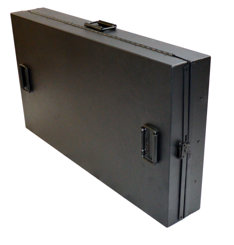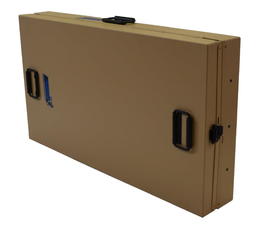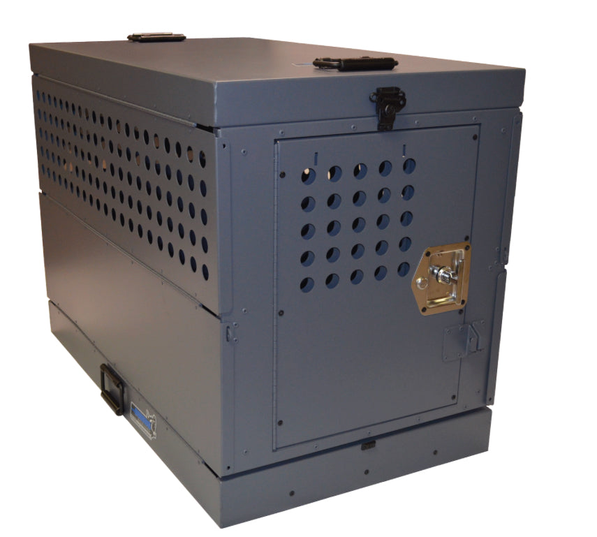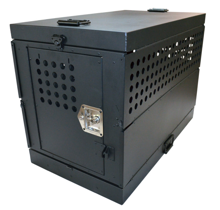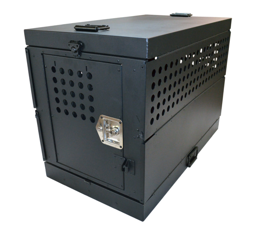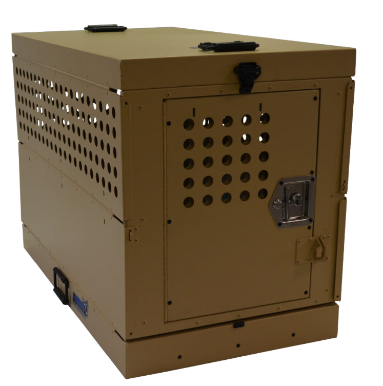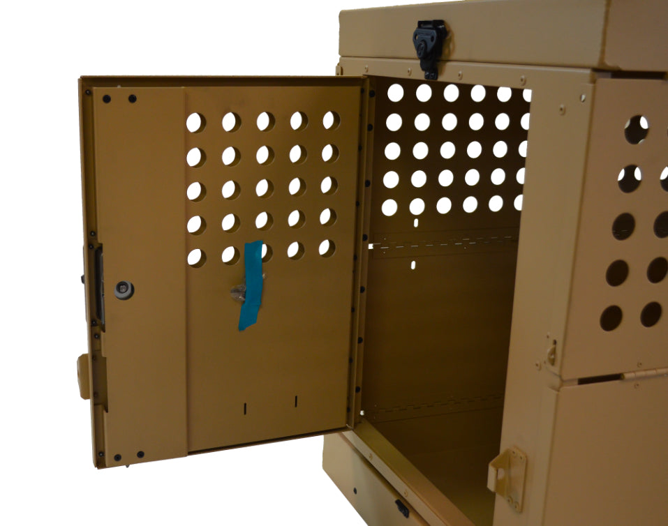 Professional K9 Series Single Compartment X-Large Collapsible Crate Dog Box. XL Police & Military Working Dog Collapsible Crate. Heavy duty collapsible crate folds down for transportation and storage. Built from heavy .063 mill finished aluminum that will never rust. Crate has 2 spring loaded rattle free, carrying handles for moving when crate is set up and 1 spring loaded rattle free, carrying handles for moving when crate is collapsed. Double wall door is build of .090 mill finished aluminum and has a stainless T-handle with 3 point latching system for strength and security and is slotted for a crate cooling fan. Locking mechanism covered on the inside by another layer of .090 mill finished aluminum to deter K9 from biting at it and trying to open door. Easily sets up and collapses without the need for tools. Fully powder coated inside and out. All measurements are in Inches and include any exterior hardward such as handles and clasps