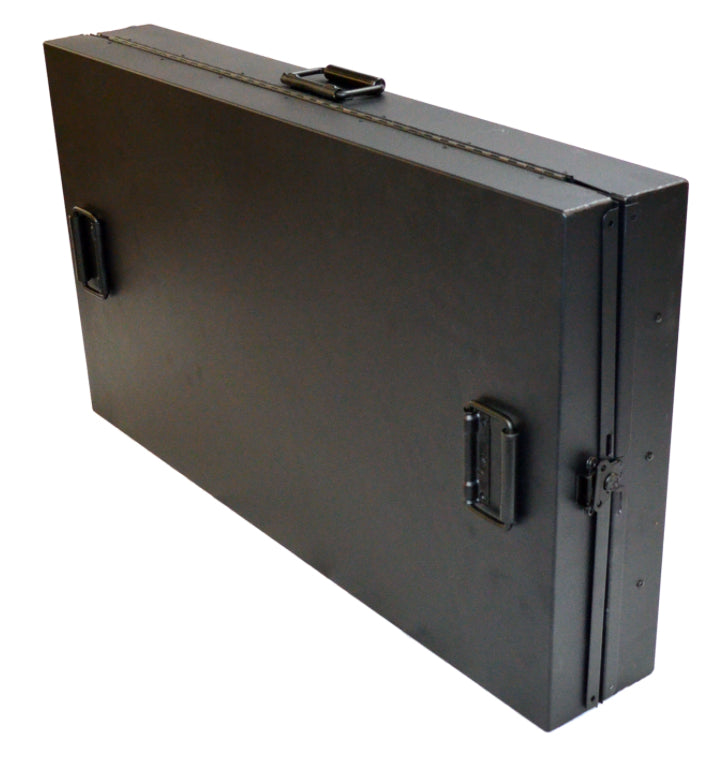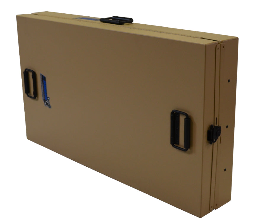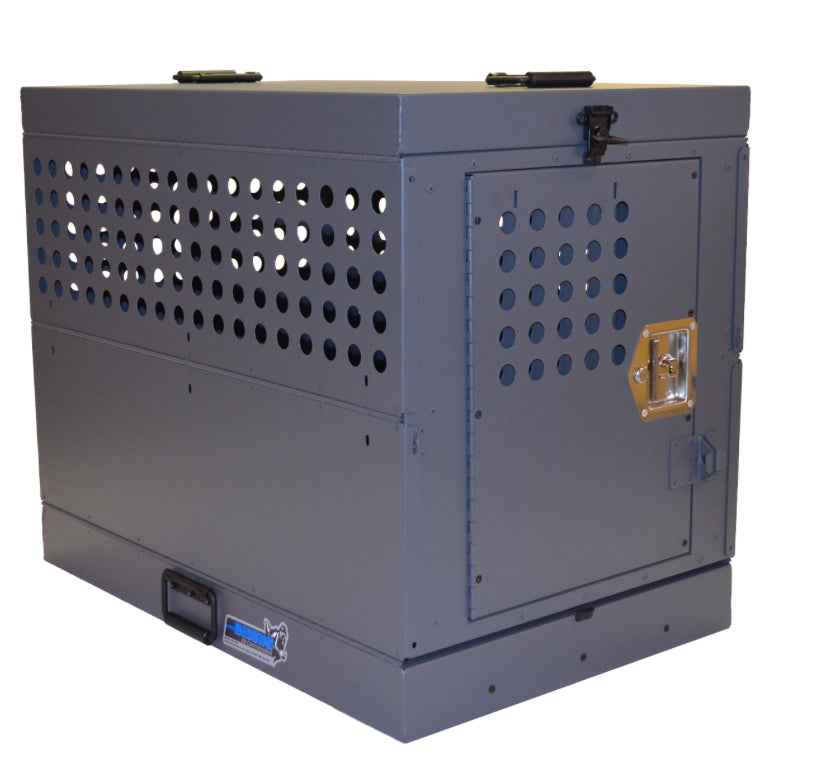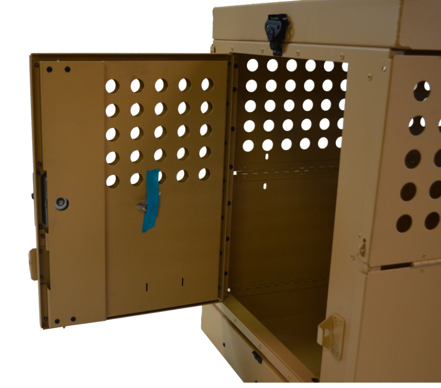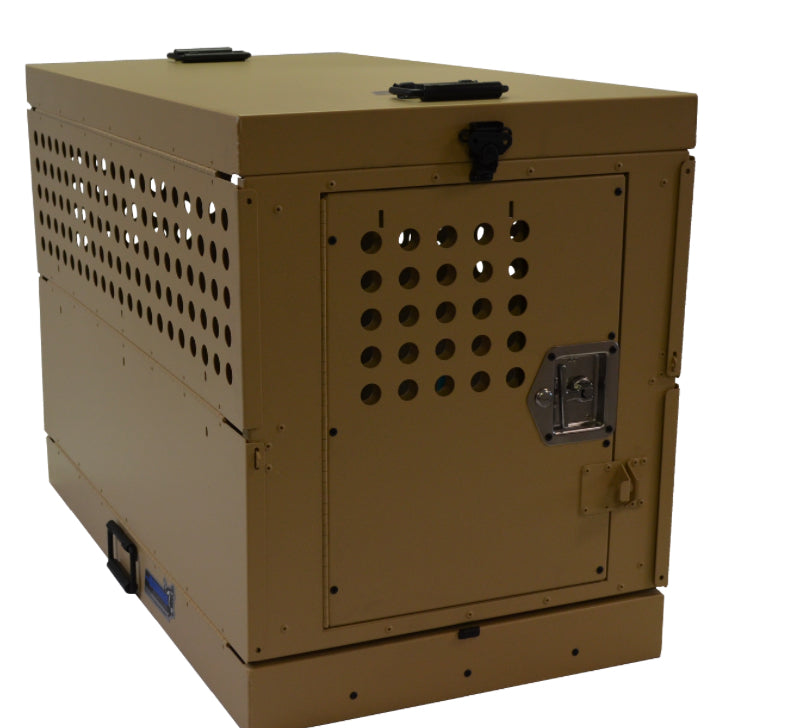 Professional K9 Series Single Compartment Large Collapsible Crate Dog Box. Large Police & Military Working Dog Collapsible Crate. Heavy duty collapsible crate folds down for transportation and storage. Built from heavy .063 mill finished aluminum that will never rust. Crate has 2 spring loaded rattle free, carrying handles for moving when crate is set up and 1 spring loaded rattle free, carrying handles for moving when crate is collapsed. Double wall door has a stainless T-handle with 3 point latching system for strength and security and is slotted for a crate cooling fan. Locking mechanism covered on the inside to deter K9 from biting at it and trying to open door. Easily sets up and collapses without the need for tools. Fully powder coated inside and out. All measurements are in Inches and include any exterior hardward such as handles and clasps.