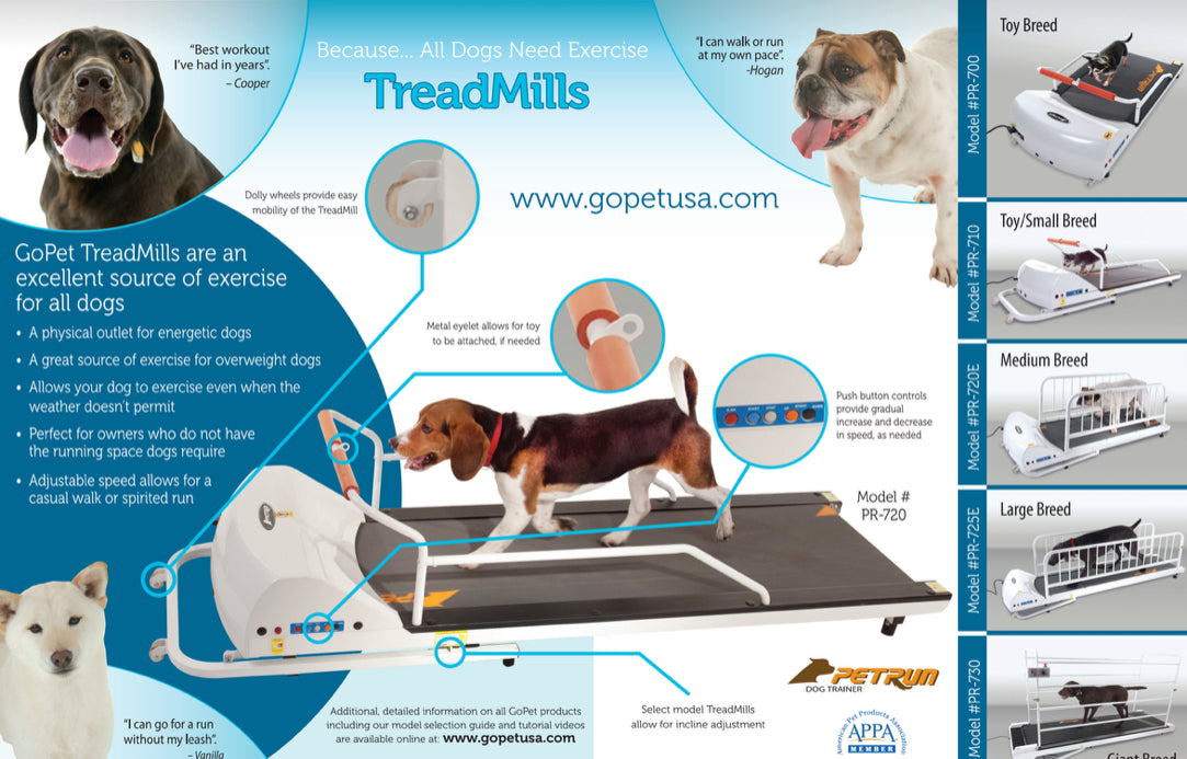 The GoPet PetRun PR700 dog treadmill has a silent driving system for quiet operation, It comes with a wireless remote control, and a safety locking system. The dolly wheels make it easy to move around, the metal eyelet allows for a toy to be attached. Push button controls also allow for gradual increase and decrease speeds.